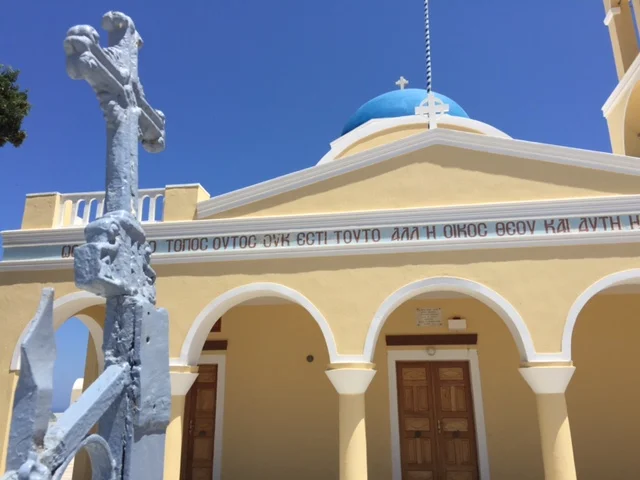 We had been walking around Oia and decided to rest on a bench beside a blue capped church. It was sweltering, so we took advantage of shade provided by the olive tree over our bench. We placed our phones on the bench and soaked in the sights and people around us.